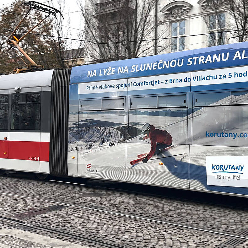 Ein besonderes Highlight: Im Jänner fährt erstmals eine gebrandete Straßenbahn durch Brno und macht Lust auf den Sonnenskilauf in Kärnten. Gleichzeitig wird die neue Bahnverbindung beworben – von Brünn in nur fünf Stunden auf die sonnigsten Pisten Kärntens. Damit wird nachhaltige Anreise mit emotionaler Winterkommunikation ideal verknüpft.